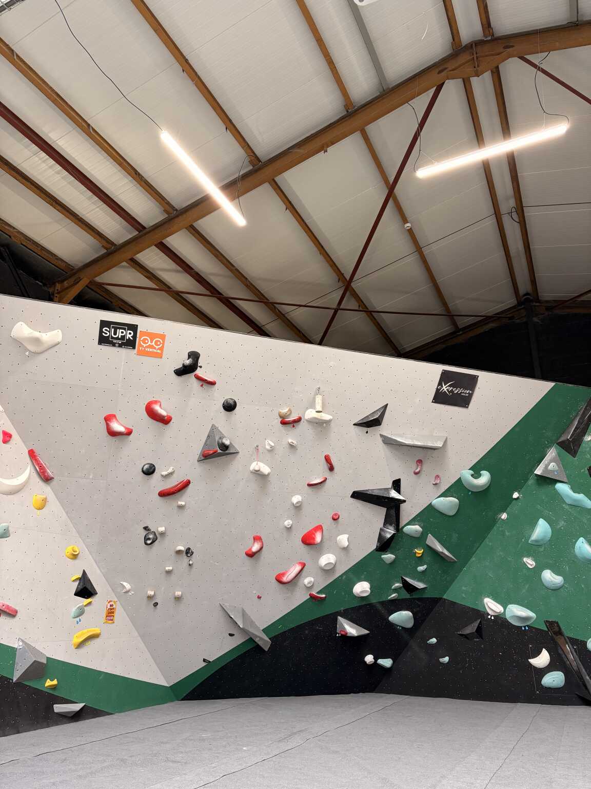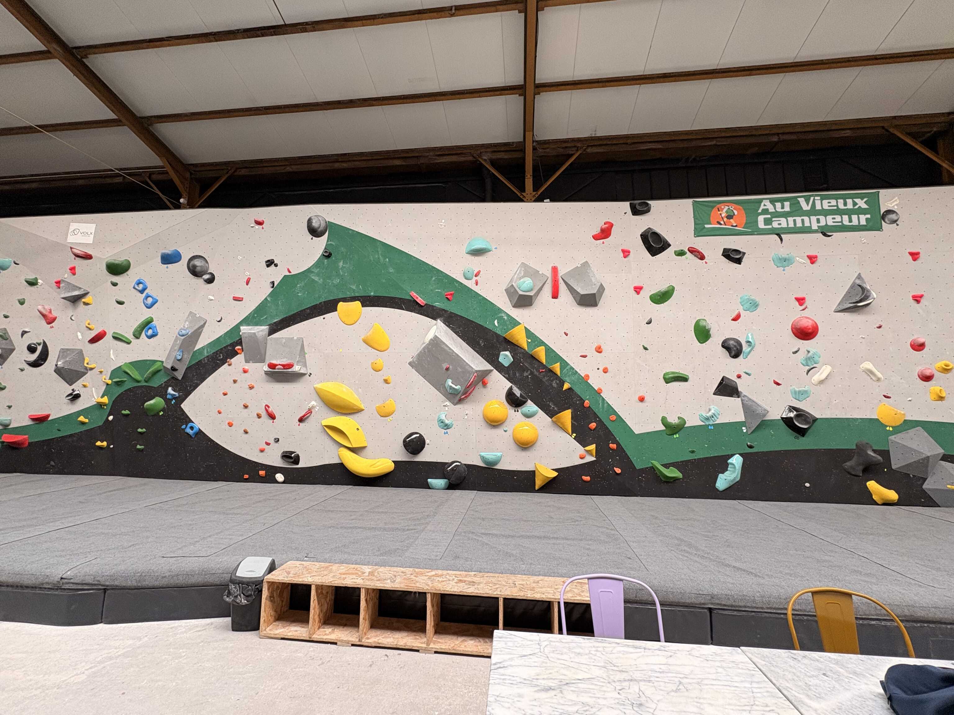 Voici le mur le plus accessible, il vous permet de prendre les répères avec le mur, les prises, la hauteur et apprendre à se réceptionner. Eviter de sauter de tout en haut pour plus de confort, et surtout ne pas se receptionner avec les mains.